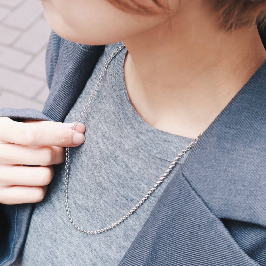 程よい太さのシルバーチェーンで、関節部のリングに留め具をかけることで長さを調節できます。