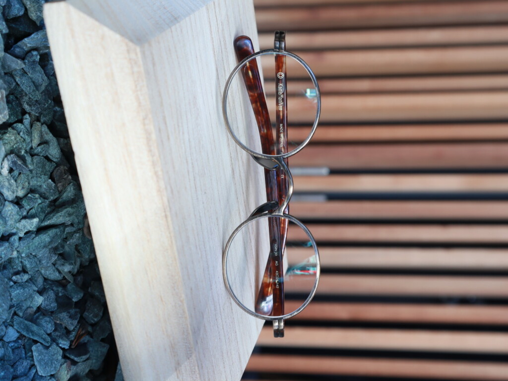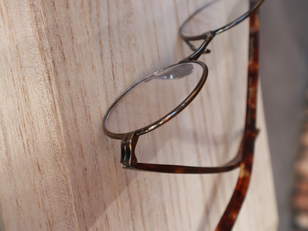 小ぶりなラウンド型のメタルリムに艶のあるプラスチックテンプルの組み合わせが美しいコンビネーションフレームです。