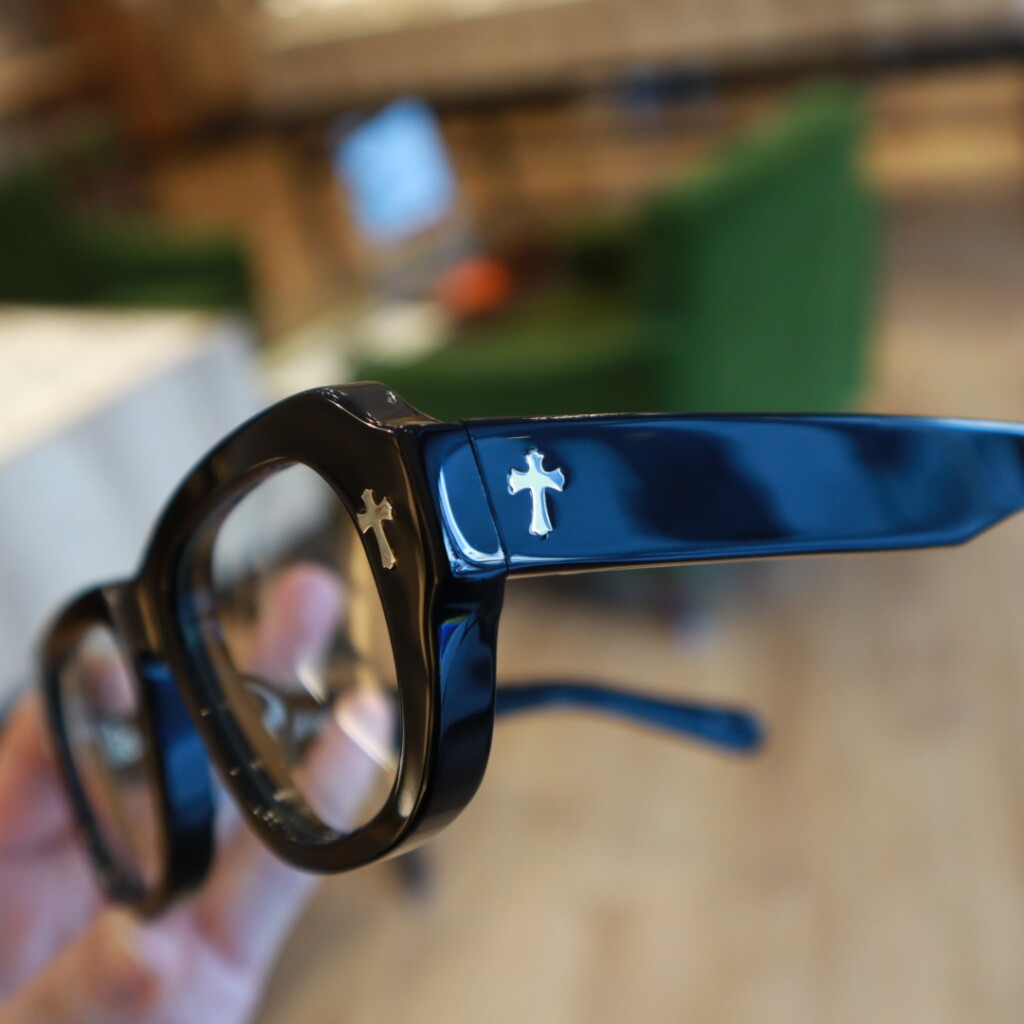 ティアドロップ型のレンズシェイプとスクエア調のボリュームのあるフレームが特徴的なモデルです。